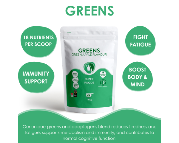 Our Greens product helps reduce tiredness and fatigue, supports metabolism and immunity, and contributes to normal cognitive function.